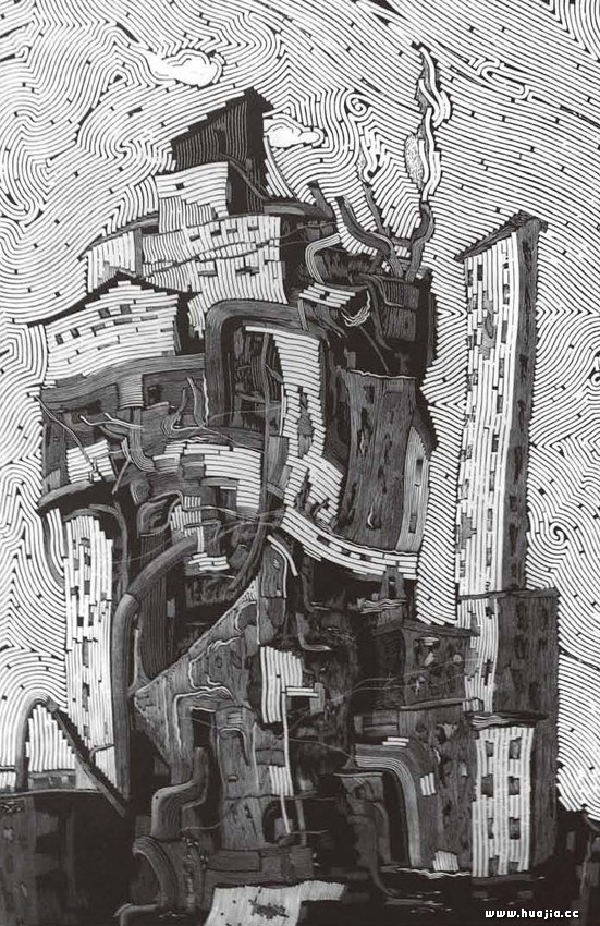 彭伟《围城之居》,黑白木刻,120cm×80cm,2009