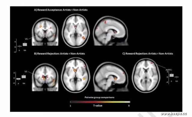 在创意研究期刊的新研究“艺术家奖励制度在金钱奖励的接受和拒绝中的反应性”中,艺术家和非艺术家的多巴胺奖励系统的大脑扫描图 研究人员在第二次测试中还发现,当他们被告知拒绝绿色方块时,艺术家在与多巴胺有关的大脑部分(前额叶前部)显示出更大的反应。换句话说,艺术家在获得金钱方面付出的努力较少,而当他们知道自己无法获得金钱时,他们反而会更加努力。 研究人员写道:“总的来说,我们的结果表明艺术家的多巴胺能奖励系统中存在明显的神经特征,他们不太愿意对接受货币奖励做出反应。”