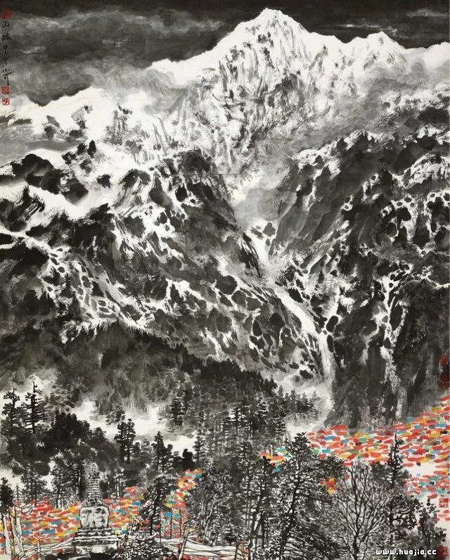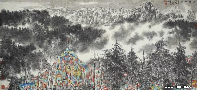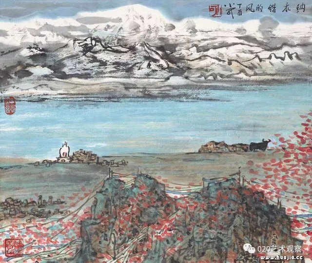 纳木错的风/46×54cm ”李小可的作品经常以“山魂”“远方”为题,在他眼中,喜马拉雅、苍茫雪域已不再是一种单纯的自然风景,而是人们对遥远和崇高的追溯。他是怀着敬畏之心,用无声的笔墨表达他对藏族聚居区文化和内在精神的理解,以及他对理想和远方的朝圣。无声的雪山,成群的玛尼堆,飞扬的五彩经幡,在他的表现下都饱含了深情。李可染过去常讲“可贵者胆,所要者魂” ,在李小可看来,“魂”的核心就是“情” 。“这次展览以‘山川乡国情’为主题,就是说山水笔墨中要含有情感。艺术作品是对生活或是对人生经历的一种‘生之恋’情,因为有情,所以绘画语言表现出来的景色就具有了精神。我的‘雪域藏迹‘系列作品更多是表现自己对藏族聚居区特殊的情怀。 ”
