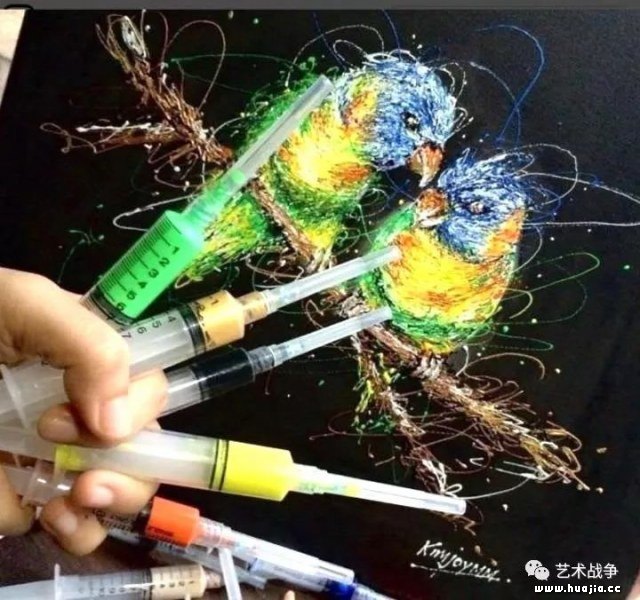 看看真正的注射器书法 邵岩原来并不是个江湖书法家,但邵岩用注射器写书法之后,就带有江湖书法家的表演套路,以及装神弄鬼的江湖书法家忽悠作派。 下面看看真正的江湖书法家的注射器写空心书法。 看看真正的注射器艺术 国外早就有用注射器来创作的手法。一个菲律宾的护士闲来无事,就用注射器替代画笔,以下是她的画作。