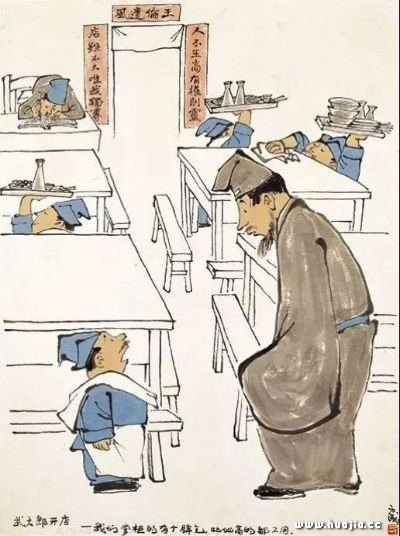 武大郎开店——我们掌柜的有个脾气,比他高的都不用 方成以独有中国特色的水墨漫画,将中国民间传说和古代文学作品中的人物绘形纸上,钟馗、济公、鲁智深、布袋和尚等等侠义之士皆栩栩如生,神态逼真。“幽默是一种处世之道,也是养生之道,漫画是人生中点燃欢笑的温暖的灯”。这句话是方成的名言。思想性是方成作品的一大特点。在接受媒体采访时,方程曾表示:“中国漫画的特点是搞批评和自我批评,我们是画思想,画作风,画一件事情。在文字上,我们经常借用古代的诗词,我很多漫画都运用了这种手法,还有就是借用古代的故事创作。”在方成看来,漫画的批评性是推进社会前行的动力,幽默是文化高度发展后自然形成的一种语言方式。