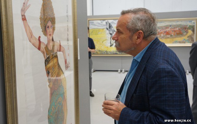中外嘉宾莅临开幕式 高质多元的国际化艺术水准和风貌 据丁杰主任介绍,本次展出作品由“一带一路”沿线国家主题、历届北京国际美术双年展所藏优秀作品和中国中青年美术家海外研修工程的成果作品三部分组成,皆出自国内名家之手,数量虽然不多,却以小见大。“一带一路”主题作品是中国美协今年首次选送赴国外展出,以独具中国传统艺术特色的水墨语言,描绘出和而不同的“一带一路”沿线国家风情,这其中有表现异域自然景观的独特魅力,如何加林《天空之城》、石峰《马其顿奥赫里德湖印象》等,以中西融合的笔墨色彩抒发了画家的浪漫情怀;有描绘外国城市建筑印象,如余光清《波鲁纳鲁瓦古城》、梁时民《罗马尼亚佩列什王宫》等,把中国画的笔墨韵味与西画的明暗光影相结合,创造了当代中国表现外国建筑特别是文化遗址的的诗化意境;有描绘外国人物风俗,如李青稞《阿联酋扎耶德清真寺》、黄华三《科威特小夫妻》等,把中国画的传神写照与西画的写实造型相结合,展示中国美术走向世界、表现和传承“丝路精神”的新视角,体现了中国美术家们开阔的创作视野和高超的艺术技巧,定会令国外观众倍感亲切。