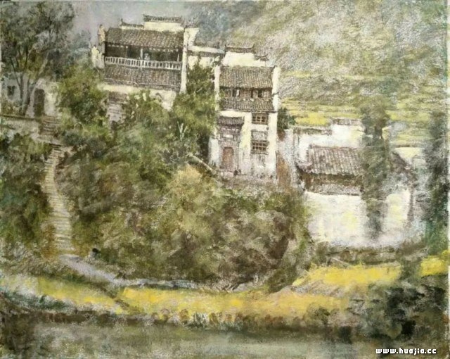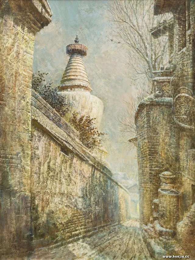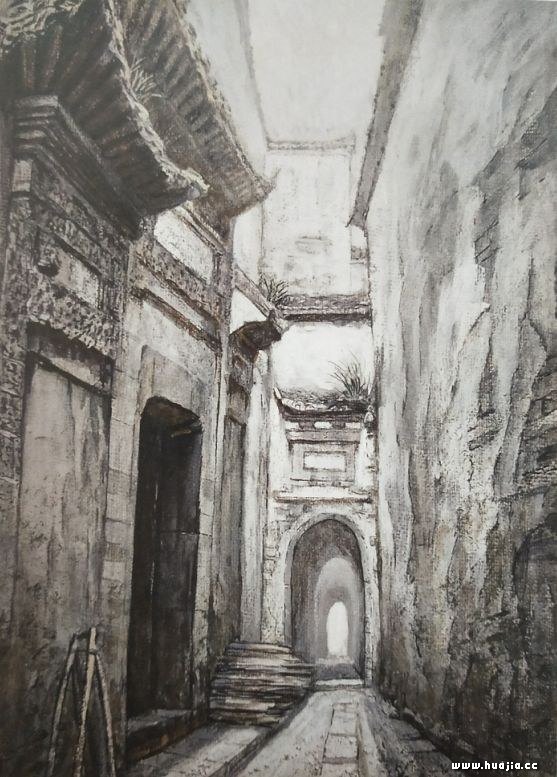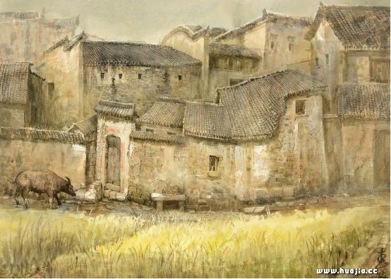 一九八三年夏天,我来到了皖南山区。当时的黄山脚下从汤口小镇到黟县的西递、宏村,那种古朴的环境对我产生了强烈的震撼。我时常在铺满青石板的古街上徘徊,似乎总也走不够,两边民居的白墙和木板似在喃喃细语,好像在诉说着千百年的历史变迁。我也时常静静地坐在屋檐下的石墩上,聆听着心灵与民居的对话。在这以后我用十年的时间走遍了全中国的三十多个典型民居分布点,从云南的瑞丽、西双版纳、丽江到西藏、新疆,从福建的土楼到河南陕西的窑洞、地坑院,我画了数千张民居的写生,并深入地做了中国传统居住建筑结构形态与古代社会的结构形态分析,最后因为这方面的成果而被邀请去美国UCLA大学做访问学者。那时候的绘画形式是两种形态,一种是写实的水彩,一种是有点奇倔而神秘的油画、漆画。一九八五年,漆画被中国美术馆收藏,由于要表现民居的古朴、厚实,我用了一些特殊技法,使得水彩画较为厚重而有油画感觉。我于一九九零年开始在国内、港台等地举办个人画展。