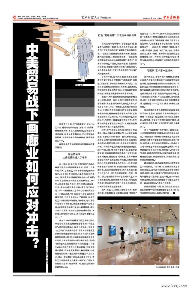 《中国美术报》第122期 艺术财富 处暑节气之后,天气渐渐凉了,走在798艺术区,随处可见形形色色、五花八门的商铺,画廊散落其中,不复从前的热闹。记者走访了多家画廊,许多从业者都表示,受中美贸易战的影响,本来就势单力薄的画廊业,所受冲击着实不小。 画廊从业者要如何面对这秋风四起的萧瑟境况?