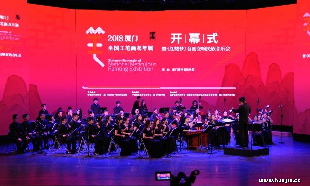 本次展览开幕式创新性地结合中国传统曲目作品,策划“2018厦门全国工笔画双年展开幕式暨《红楼梦》音画交响民族音乐会”。音乐会由厦门青年民族乐团担任演出,结合2018厦门全国工笔画双年展宣传片,展示参展作品,音画结合,别开生面,让观众耳目一新。 中国画是我国代表性的艺术门类,名作大家代代迭出,以其民族性、艺术性而享誉世界,成为人类的文化宝库和艺术经典。基于当代工笔画兴盛的历史现实背景,本次展览经过厦门历年工笔画活动的积淀,主办方积极论证,确定以全国征稿的形式开拓新的尝试。经过积极筹备、广泛发动,展览投稿踊跃,数量之多、质量之佳令人印象深刻,足见全国各地作者的创作热情和展览的影响力。经过中国美术家协会组织专家进行严肃认真的评审,最终评出入选作品257件,含入会资格作品60件。作品题材涵盖中国画各科,既有对传统历史文化的观照与思考,也有对当下社会生活的审视与表现,特别呈现了改革开放以来富有活力的社会变革气息,凌越古今的发展步伐和丰润多彩的生活记忆,在技法材料上既有致敬传统经典的重构新象,也有西学东渐的嫁接新探,还有法在体外的拓荒新思。