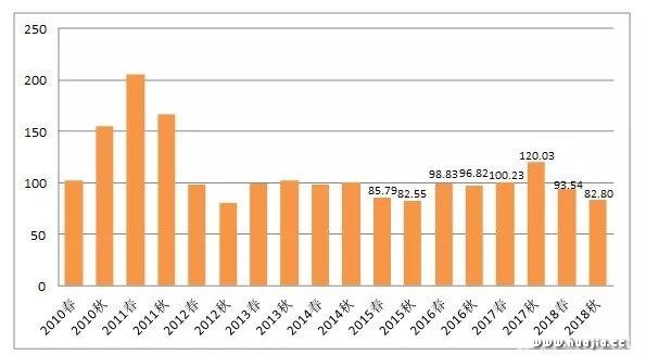2018年度,由于高价拍品的大幅减少,10家公司单件拍品成交均价由2017年的44.55万元/件(套)下降至36.42万元/件(套)。10家公司拍品均价的峰值是在2011年,达65.28万元/件(套),此后随着市场调整,2016、2017年持续回升,而本年度跌落至7年来最低值。