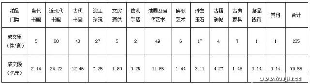 235件(套)拍品的企业分布情况是: 北京保利94件(套),共计30.19亿元 中国嘉德67件(套),共计24.12亿元 北京匡时38件(套),共计8.92亿元 西泠拍卖13件(套),共计2.23亿元 广东崇正7件(套),共计2.13亿元 北京荣宝10件(套),共计1.93亿元 上海朵云轩2件(套),共计0.35亿元 北京诚轩2件(套),共计0.28亿元 北京华辰1件(套),共计0.22亿元 北京翰海1件(套),共计0.17亿元 235件(套)拍品的门类分布情况是: 当代书画5件(套),成交2.14亿元 近现代书画68件(套),成交24.22亿元 古代书画43件(套),成交12.46亿元 瓷玉珍玩27件(套),成交7.25亿元 文房清供5件(套),成交1.80亿元 信札手稿2件(套),成交0.25亿元 油画及当代艺术49件(套),成交11.85亿元 佛教艺术6件(套),成交1.44亿元 珠宝玉石17件,成交3.11亿元 古籍碑帖4件(套),成交4.27亿元 古典家具7件(套),成交1.48亿元 邮品钱币1件(套),成交0.14亿元 其他门类1件(套),成交0.14亿元