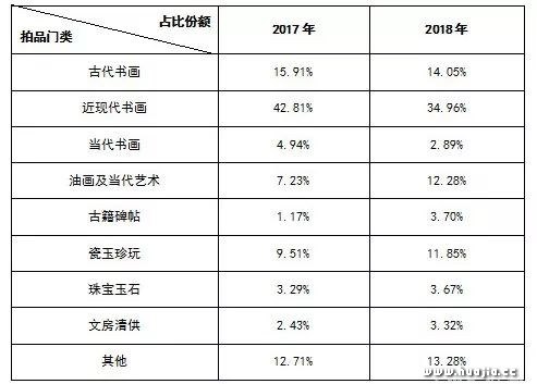 2018年度,油画及当代艺术成交额占比12.28%,增长4.96个百分点;瓷玉珍玩成交额占比11.85%,珠宝玉石成交额占比3.67%,文房清供成交额占比3.32%,佛教艺术成交额占比2.69%,邮品钱币成交额占比1.84%,古典家具成交额占比1.68%,紫砂茗具成交额占比1.19%,较上年均有增长。