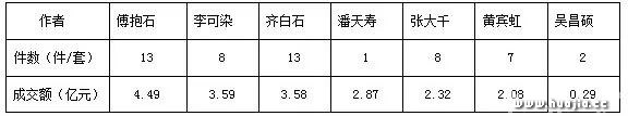 2018年度,近现代书画板块中以潘天寿《无限风光》最为突出,以2.87亿元高价成交,成为本年度全国文物艺术品拍卖市场最高价作品。傅抱石高价作品在出现最多,过千万作品成交13件(套),共计4.49亿元。李可染、齐白石、潘天寿、张大千、黄宾虹、吴昌硕等近现代大师作品表现依然不俗,千万级拍品分别成交8件(套)、13件(套)、1件(套)、8件(套)、7件(套)、2件(套)。