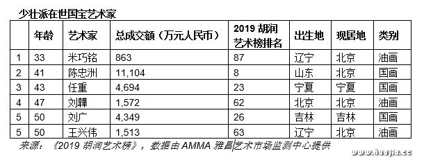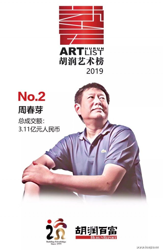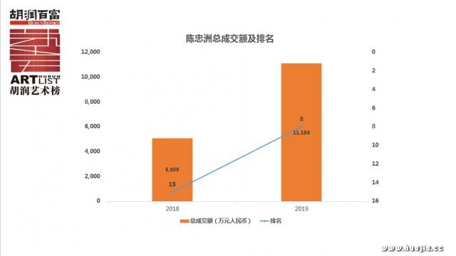 41岁的国画家陈忠洲成交额比去年上涨118%,以1.1亿元从去年的第15位跃升到第八。今年是陈忠洲连续第二年入围胡润艺术榜。