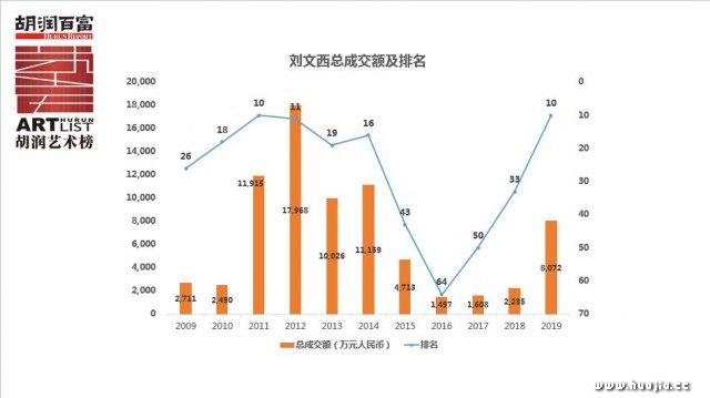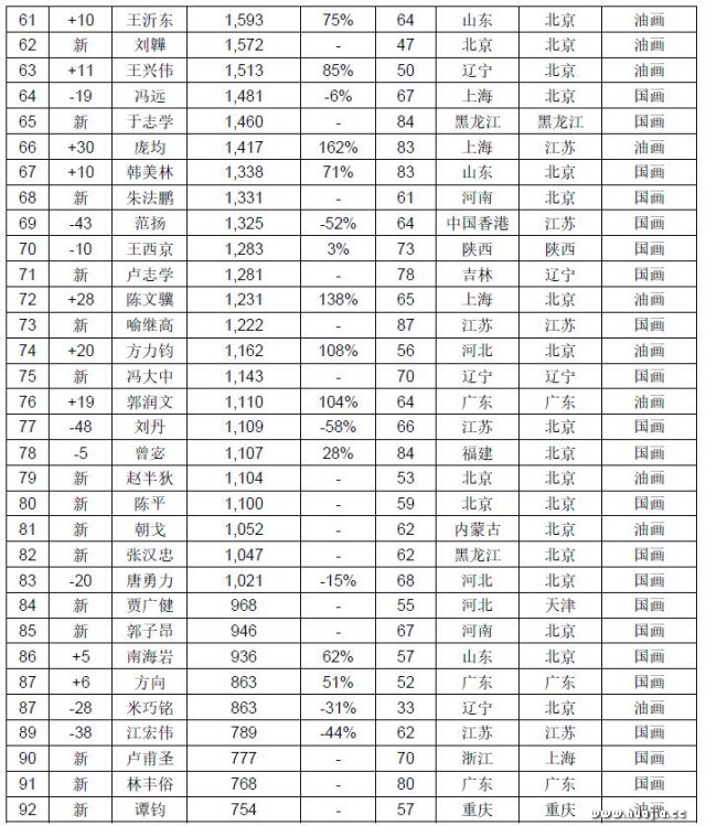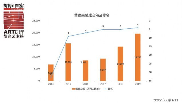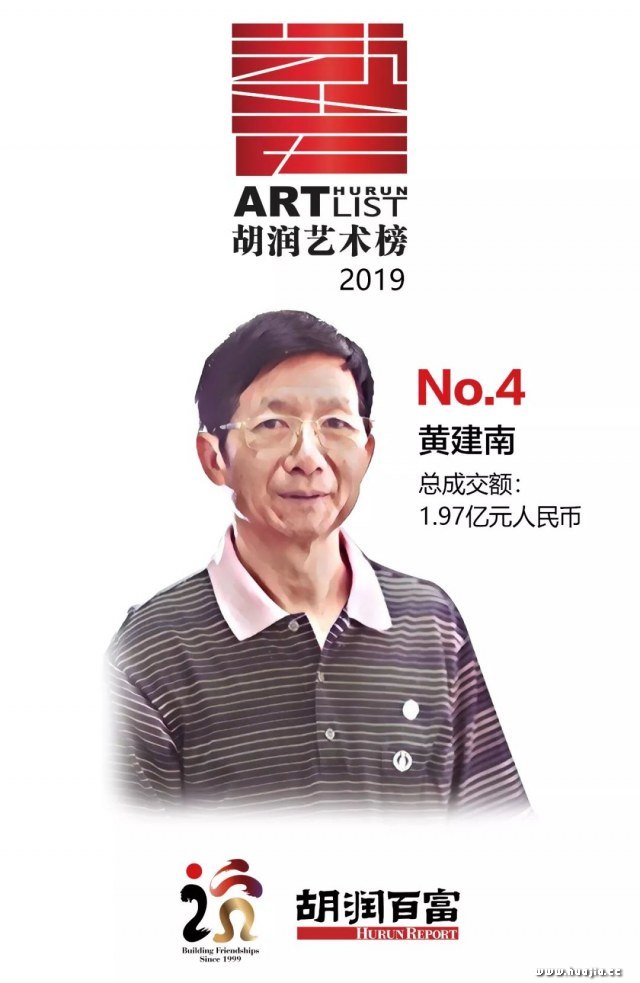 67岁的黄建南成交额比去年增长38%,达到近2亿元,比去年上升一位至第四。黄建南已连续六年入围胡润艺术榜。