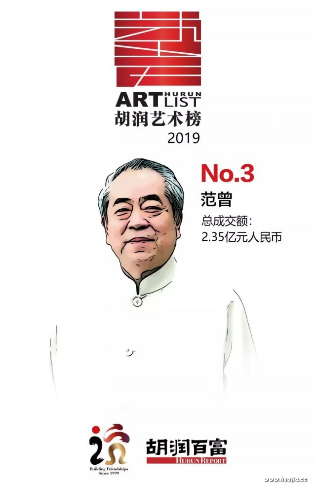 81岁的国画家范曾成交额比去年增长48%,达到2.4亿元,从去年的第四重返前三甲。范曾已连续十二年入围胡润艺术榜,2011、2012年曾位列榜首。