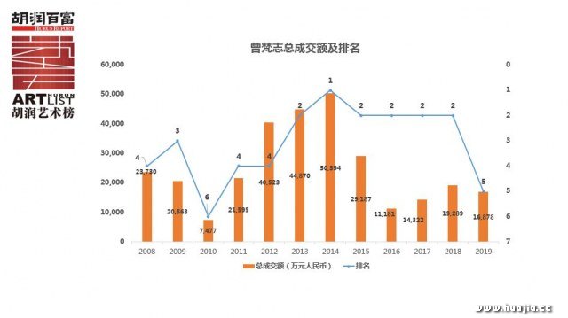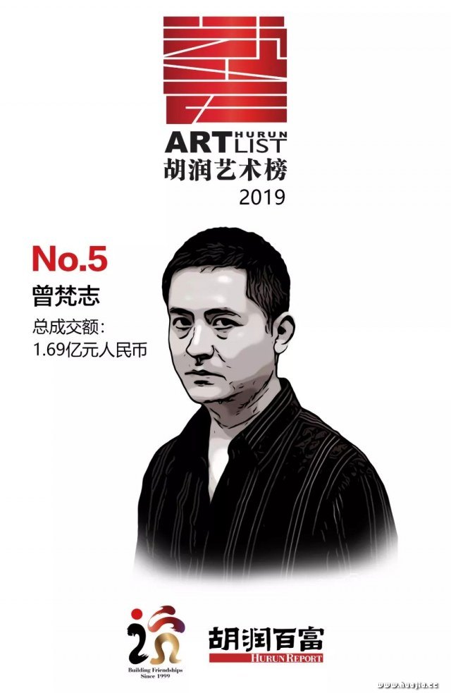55岁的油画家曾梵志成交额比去年下降12%,至1.7亿元,排名下降3位至第五。他的总成交额中有五成多来自于三幅拍的最贵的作品:由中国嘉德以3565万元拍出的1992年《肉系列之三:献血过量》、由北京保利以2875万元拍出的1999年作《面具》,以及由佳士得以2351万元拍出的2004年作《我/我们》。曾梵志已连续十二年入围胡润艺术榜,2014年曾位列榜首。