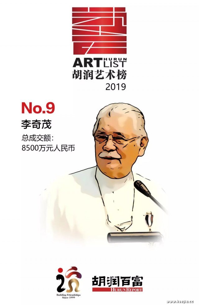 94岁的国画家李奇茂首次上榜便以8500万元总成交额位列第九。他的成交额主要来自香港金字塔拍卖公司拍出的三幅作品:5806万元拍出的《牛童》、1451万元拍出的《万马奔腾》和1203万元拍出的《牧牛图》。