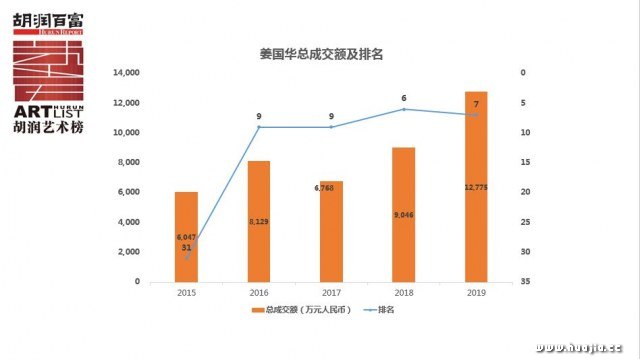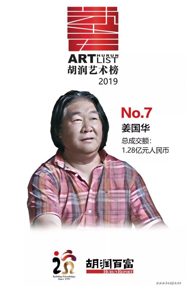 65岁的国画家姜国华成交额比去年上涨41%,以1.3亿元位列第七,比去年下降一位。姜国华已连续五年入围胡润艺术榜。