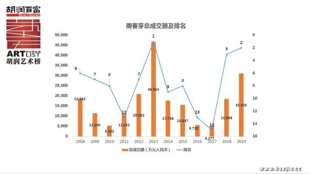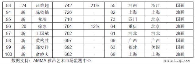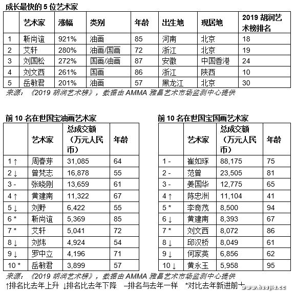 编制方法 《2019胡润艺术榜》根据2018年度公开拍卖市场作品总成交额为中国在世艺术家排名。上榜艺术家均为在世的中国大陆及港澳台艺术家。上拍艺术品均为通过公开场地拍卖,而不包括通过非公开场地出售(画廊、艺术家本人及私人交易),且包含拍卖公司的中介费用。 此外,请读者注意:如果某位艺术家去年刚好没有很贵的作品上市,那么他可能排不到前面,但这并不代表该艺术家的优劣,如果该艺术家今年有很贵的作品上市,那么明年“胡润艺术榜”中他的排名可能就会靠前。 AMMA雅昌艺术市场监测中心为此次“胡润艺术榜”提供了原始数据。AMMA雅昌艺术市场监测中心调查了中国嘉德、北京匡时、佳士得、保利香港、香港苏富比、华艺国际、北京荣宝、荣盛国际、广东崇正、上海敬华、上海嘉禾、上海匡时、中贸圣佳、西泠印社、和永宝斋等拍卖行的拍卖数据。