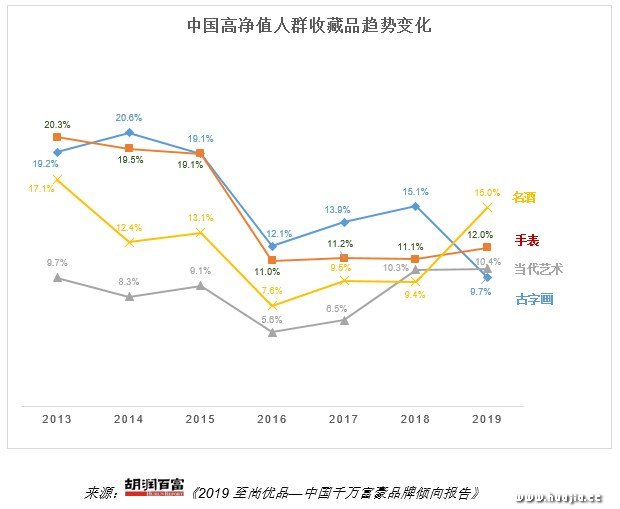 中国高净值人群未来三年想要尝试的活动中,艺术品收藏位列第十,比上一年有所下降。热爱收藏的人群主要集中在经济较为发达的东部地区。过去四年,珠宝玉石、手表和古字画一直位于收藏榜的前三位。今年,名酒收藏的比例上升,从过去的第四、五名升至第一位,而古字画则跌出前三,降至第四。千万资产高净值家庭平均4个人住在235平米的房子,亿元资产高净值家庭平均5个人住在350平米的房子。近一半受访高净值人群的收藏方式为自行购买。(根据胡润百富《2019至尚优品—中国千万富豪品牌倾向报告》)