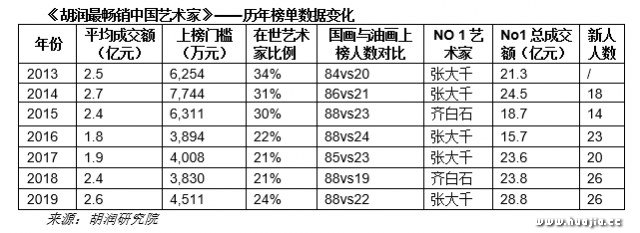 (2019年3月28日,香港)胡润研究院发布《2019胡润艺术榜》(Hurun Most Successful Chinese Artists Alive Today 2019),榜单内容为前100位中国在世“国宝”艺术家按照2018年度公开拍卖市场作品总成交额的排名。今年是胡润研究院连续第十二年发布“胡润艺术榜”、第七年发布《胡润最畅销中国艺术家百强榜》,榜单数据来源是AMMA雅昌艺术市场监测中心。 2018年艺术品市场持续复苏。纵观《2019胡润艺术榜》,总成交额、平均成交额、上榜门槛、年成交额过亿艺术家数量均有明显增长。 胡润表示:“收藏家对高端精品艺术家作品的价值是认可的。因为虽然整体市场的总成交额下滑明显,但是《胡润艺术榜》艺术家总成绩却上涨明显。” 中国十大在世国宝艺术家 前十名中3位新人,其中94岁现居中国台湾的国画家李奇茂首次上榜便以8500万元的成交额位列第九。前十名涨幅平均为43%。平均年龄69岁,比总榜大1岁,比去年前十名平均年龄大5岁。前十名中7位国画家。前十名中7位现居北京,其他3位分别现居四川、中国台湾和陕西。