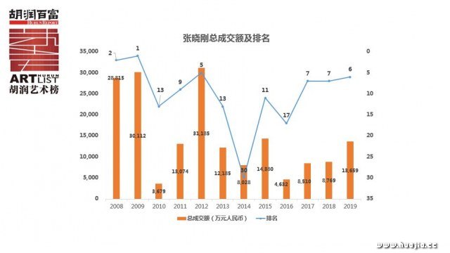 61岁的油画家张晓刚成交额增长56%,以1.4亿元排名第六,比去年上升一位。其中去年拍价最高的一幅作品是由中国嘉德以4025万元拍出的1996年作《血缘:大家庭1号》。张晓刚已连续十二年入围胡润艺术榜,2009年曾位列榜首。