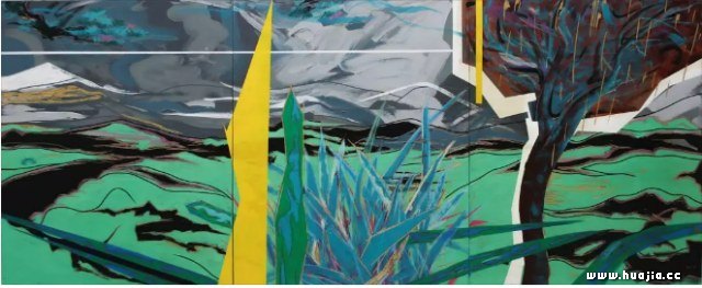 庞辛森 青青蓝的水库,240x360cm,综合材料,2019 如果说《顺天湾》《青青蓝的水库》是我本人对自然空间系统的控制与置换,那么《美术馆山上俯视》《RUNING的公园》和《竞选市长》则是从自然空间的遮挡视角去注视人的社会性空间,而这一系列社会性符号被自然空间所封闭。记得那天当我漫无目的地在山间行走,周围被密林环绕,沿着一条弯弯曲曲的小路,从一片高大的树木群间向外窥视时,一座静穆而神秘的矩形建筑突然出现,仿佛一场陡然坠落的梦境,这种自然物和人造物的默然并置,与一种克制的在场感发生呼应,《美术馆山上俯视》这幅作品就来自对这一瞬间的视觉捕捉,《美》里的美术馆被前景的树干所遮蔽,弯曲的树干与美术馆的硬边直线构成了富有形式张力的对立,两种力量在画面里喧哗、骚动,而后方的远景像坠毁其中的另外一个自然空间,同时从一种被动的坠毁姿态转向一种捕捉的空间机制,把这种张力的延续悬置到画面内部本身,而不是画面之外,直到观者忘之所观,听者抑之所闻。