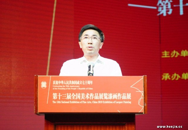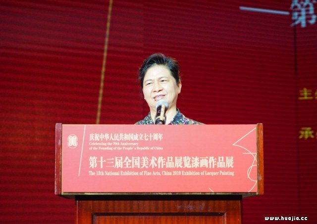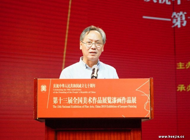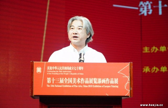 中国美协秘书长、第十三届全国美展组织委员会秘书长马锋辉主持开幕式 鲁晓波副主席在致辞中指出,漆画作为一门既年轻又古老的绘画品类,经历了一个与众不同的成长过程,特别是改革开放之后,创作理念逐步从保守走向开放,通过大胆吸收、借鉴其它画种的优点与长处,更加具有时代精神、民族气派、地域特色的创作理念。如今,漆画艺术创作题材日渐丰富,已呈现出具象、意象与抽象等多种艺术形态,全方位地表现出漆画作为一门纯艺术的绘画形式所应有的状态,并彰显出时代性、民族性、本土性等特色,融入了现代人的精神情感和审美风尚,成为一门现代艺术的标志,为新时代美术事业的繁荣发展起到了积极的推动作用。从第六届崭露头角开始,每届全国美展中的漆画作品在品质上都在稳步提升。从其清晰的发展脉络中,可以看出改革开放以来现代漆画的发展历程都和全国美展紧密地联系在一起。近五年漆画创作的繁荣,收获了“第十三届全国美术作品展览”漆画作品。本届漆画作品展的入选作品,凝聚了漆画家们对现实生活的关注和感悟,体现了他们的艺术追求和人文情怀。