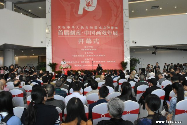 开幕式现场 10月24日,由中国美术家协会、湖南省文学艺术界联合会主办,中国文联美术艺术中心、湖南省画院、湖南省美术家协会、湖南美术馆承办的庆祝中华人民共和国成立70周年——首届“湖南·中国画双年展”开幕式在湖南美术馆举行。中国美术家协会副主席、中国人民大学艺术学院教授闫平,中国文联美术艺术中心活动管理处处长杜松儒,湖南省委宣传部常务副部长蒋祖烜在开幕式上分别致辞,中国志愿者协会副主席、中国国家画院美术馆馆长何加林代表艺术家发言。湖南省人大常委会党组副书记、副主任王柯敏宣布开幕,湖南省文联主席欧阳斌主持。