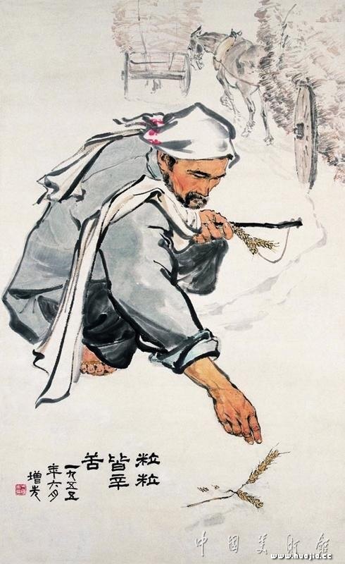 1955年3月《人民日报》发表题为《人人都要节约粮食》的社论,新中国上下提倡节约粮食。同年,方增先先生经过北方农村见到农民在地里拾麦穗的景象,印象深刻,这个构思最后创作为《粒粒皆辛苦》 中国美术馆