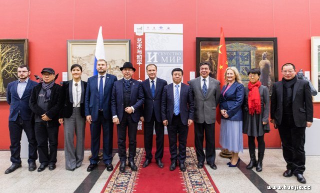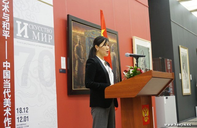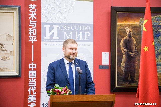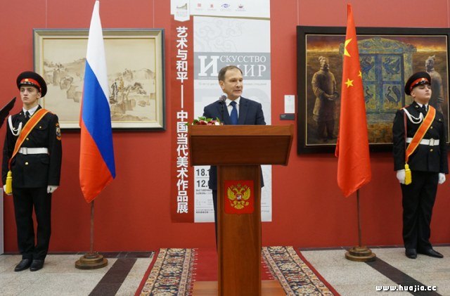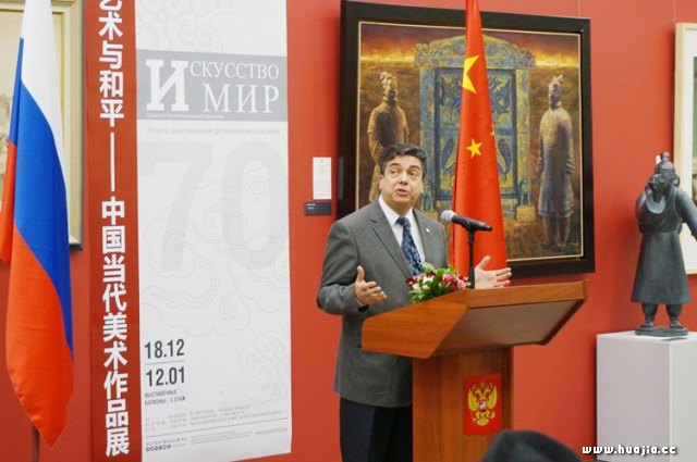 中国驻俄罗斯大使张汉晖致辞 张汉晖大使在致辞中提到,该展是庆祝中俄建交70周年框架内人文交流活动的重要项目,也是近年来中国在俄罗斯举办的规模较大的当代美术作品展。在论及中俄人文交流时,他评价,新时期中俄人文交流应着眼促进两国全面战略协作伙伴关系的发展,围绕世界和平与发展的主题,全面拓展和深化各领域合作,中俄两国人文交流必将更加丰富多彩、富有成果,成为世界文明友好交流和共同繁荣发展的典范。他最后富有激情地指出,战争年代,我们一起用鲜血捍卫世界与和平;今天,俄罗斯将和中国一道继续捍卫属于我们的荣耀,携手并肩,为和平与共同的未来努力奋斗。