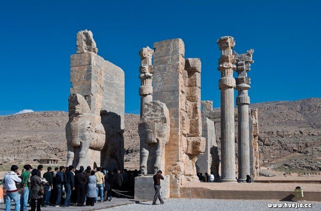 伊斯法罕王侯广场 广场周围最有名的建筑莫过于阿里·卡普宫、谢赫·鲁特福拉清真寺和极具波斯风格蓝色大穹顶的伊玛目清真寺。伊玛目清真寺被称为“世上最精美的建筑物”,从里到外均由精美的瓷砖镶嵌而成。1979年联合国教科文组织将伊玛目广场列入世界遗产。 在阿巴斯一世的统治时期,经过著名的阿巴斯一世改革,萨非王朝达到了国力的巅峰。因此伊斯法罕王侯广场是萨非王朝时期波斯社会文化生活的杰出纪念碑。 3. 波斯波利斯 Persepolis 波斯波利斯由大流士一世于公元前518年建立,是阿契美尼德帝国的首都。希腊人称这座都城为“波斯波利斯”,意思是“波斯之都”,而伊朗人则称之为“塔赫特贾姆希德”,即“贾姆希德御座”。古老的波斯是众神的王国,贾姆希德是古代波斯神话中王的名字。 令人叹为观止的是,整个宫殿的建筑群坐落在一个巨大的半人工半自然露台上,包括了宏伟的双向通行楼梯,宝座室(Apadana)、接待室和附属设施等,建筑墙壁上覆盖着多层次的雕刻装饰。波斯波利斯古城遗址提供了许多关于古代波斯文明的珍贵资料,具有重要的考古和艺术价值。