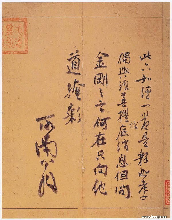 图13 陆信忠《十六罗汉图》轴 局部 绢本设色 96.4×50.9厘米(全幅) 京都相国寺 郑思肖《墨兰图》的形式感也可以由此而作进一步观察。与宋元时代画兰草的其他图像最明显的不同,是对称得有些呆板的画面,两片向上竖起的叶子,弧度相对,形成一个椭圆形的相对独立的半封闭空间,一朵兰花就出现在其中。同时,左右两边各有一条长长的兰叶向两边伸展。这四条兰叶,奠定了画面的主要结构。对称的图形使人产生不同的联想。看起来很像一朵硕大的花——椭圆形的半封闭空间是花苞,两旁伸展的兰叶是花萼;也很像一个对称的花篮——向上伸展的两条兰叶是花篮提手;甚至也像一盏油灯——椭圆形的半封闭空间是光焰,中间的兰花是灯芯。总之,对称的兰草体现出的图案式的庄严感,与正月十五宗教节日的时空是契合的。 在简洁的画面中,木印、钤印和手写的题诗是否也有形式上的意义?木印的印刷宋体和牌记的形式用于绘画是极为罕见的。同样,多达十六个字的隶书印在宋元时代也是新鲜事物。宋元时代普通民众的姓名印和吉语印中,隶书印和楷书印虽然并不少见,但像这个十六字印章一样字数很多的“词语印”却相当罕见。从效果上看,十六字印和碑刻拓片颇为相似,体现出说法的庄重之感。规矩的隶书和印刷宋体一样,都是通俗字体。画上郑思肖的题诗虽然是手写,但也使用了比较规整的楷书,与他为叶鼎手抄《金刚经》所写的题跋很不一样。【图14】《金刚经》的题跋写于1299年腊月初八以后,落款也是“所南翁”,时间上应和《墨兰图》题诗相去不远。行书的笔法与宋元时期的禅僧书风有近似之处。而《墨兰图》的题诗则显得庄重严谨,与木印、十六字隶书印,乃至对称的兰草一道,共同烘托出庄严礼佛的气氛。