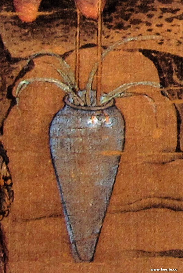 图3 (传)玉涧《墨兰图》卷 纸本水墨 32.5×57.5厘米 藤田美术馆 纵览宋元以来的花卉绘画,会看到这两幅墨兰图实是从折枝花卉演化而来。折枝花卉有两种典型画法,一是字面意义的折枝,即画出植物被折断后静态摆在眼前的状态。二是取植物顶梢的特写,往往画成植物从画外伸展到画面里的样子。当两种折枝画法相中和,空间感就变得模糊。为庆祝宋理宗谢皇后生日所画的《百花图》(吉林省博物馆)中就可以看到这种空间模糊的折枝花。【图4】其中一段恰是一株设色的兰花,同样没有画出根或地面。宋元时代民间陶瓷上的装饰图像中,也可以看到大量的折枝花卉。其中有一些萱草纹样,比如吉州窑褐彩开光折枝花卉纹梅瓶(马鞍山市博物馆)开光中的花草【图5】、吉州窑褐彩海涛萱草纹枕(江西省博物馆)枕侧的花草,其简率的笔法和模糊的空间感,都与郑思肖的墨兰有相似之处。