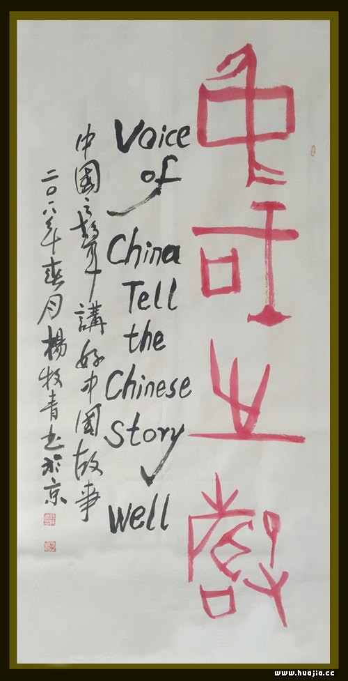 款识:中国之声。Voice  of  China  Tell the  Chinese  story  well  中国之声,讲好中国故事。二O一八年春杨牧青书于京。