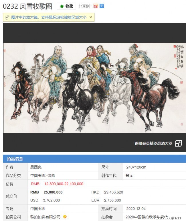 2020年12月,吴团良作品《风雪牧歌图》在“2020中国雅拍秋季拍卖会”最终以2500万落锤成交,创造了同类绘画题材的又一个高峰。他的这幅画以草原为背景前后共画了九匹马,有人算下来他的一匹马就价值277万元,足以换一辆法拉利跑车!