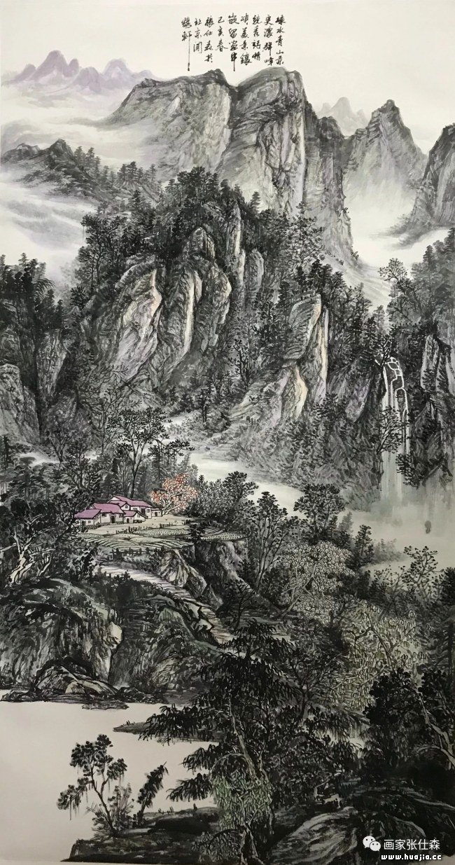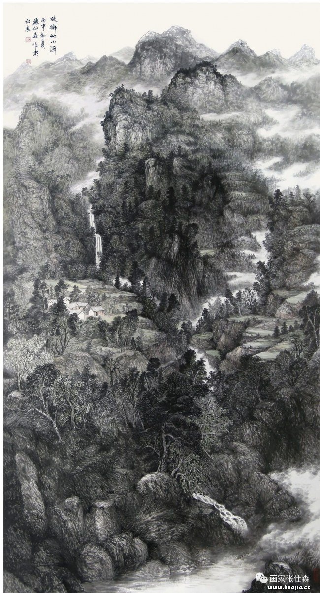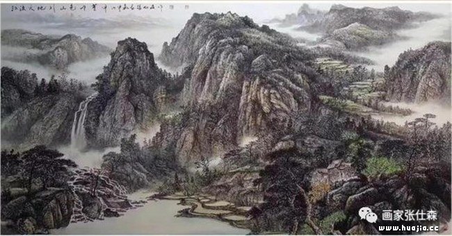 观仕森作品画面意境悠长,起承转合天人合一,道出了具有自家风貌的全景山水气象,他笔下山水大开大合,似行云流水自然充实、气象博大格调高雅。南北宗融合,中西方结合的定位将中国画中的高远、深远、平远、阔远运用在每一幅作品中,让人百看不厌爱不释手。没有常年写生的积累,没有对山水的挚爱和深刻领悟以及对大自然敬畏之情是无法将笔下山水刻画的如此动人的。