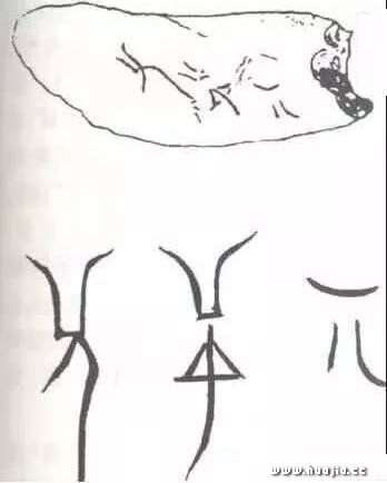 上图是六千多年前红山上古白玉刻划文字(图片来自头条网友提供),其与八、九千年的贾湖骨刻文字非常相似(见《全球首发:杨牧青破译八千年前贾湖遗址16个符号文字》一文),又与四、五千年的马家窑陶器涂写文字很相似(见《杨牧青主讲:从甲骨文字探索中国书法之美——怎么写好甲骨文书法》相关内容)。又知,当前发现最早的刻划文字是峙峪骨雕遗物,距今两万八千多年(见下四图,著名学者王大有先生考释为“燧人弇兹开天”,来源《寻根万年中华》)。