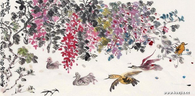 他的书写性语言超越了传统的作为一种技巧范畴的以书入画,甚至摈弃了皴法,用点线的表现性来代替皴法,充斥画面的是层层铺写的富于张力的茂密笔意,以及墨与色 集染互动造成的浓淡变化和明暗关系。在许多作品中,山石甚至被抽象出来仅仅表现为 既遒劲又连绵的优美线条 ,和富于韵律的节奏感。王易的花鸟画同样老辣大气。