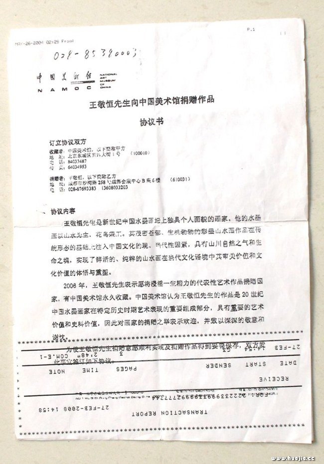 王敬恒先生向中国美术馆捐赠作品 协议书(传真件)