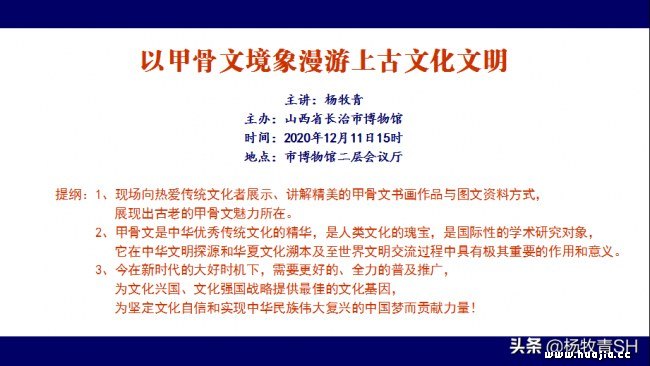 据艺界报/艺界网讯:2020年12月11日下午,杨牧青《以甲骨文境象漫游上古文化文明》为题在山西省长治市博物馆开讲座谈。