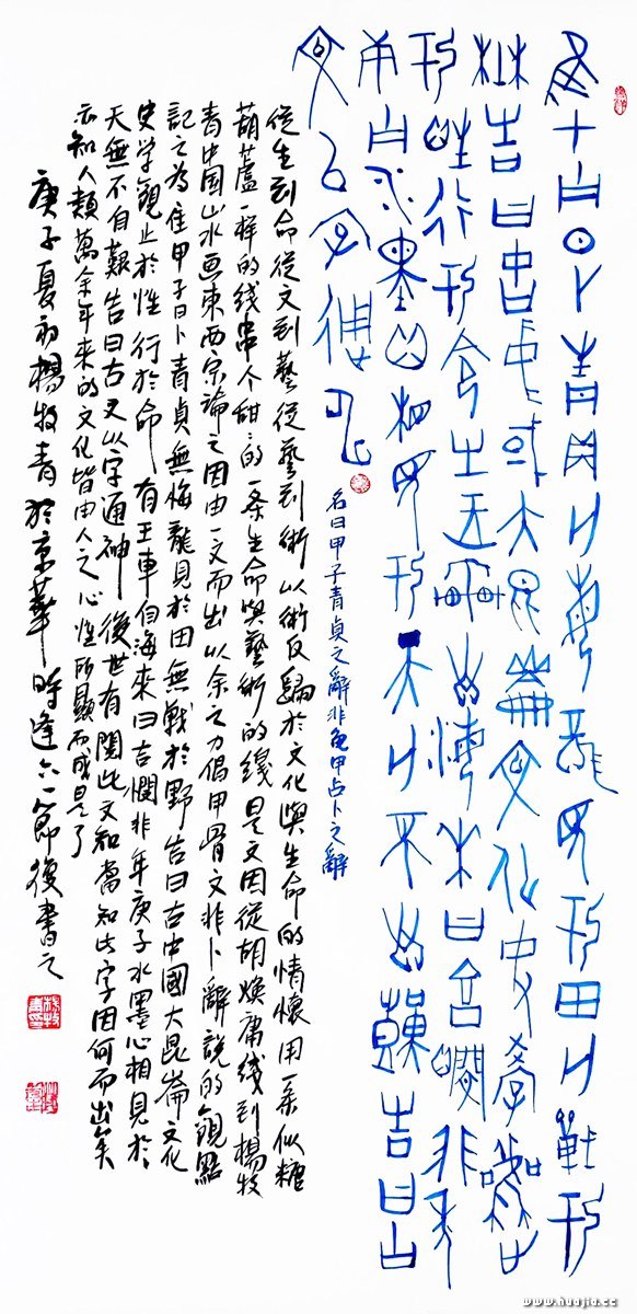 名称:隹甲子日卜规格:100cm x 50cm/5平尺款识:从生到命,从文到艺,从艺到术,以术反归于文化与生命的情怀,用一条似糖葫芦一样的线,串个甜甜的一条生命与艺术的线,是文因《从胡焕庸线到杨牧青中国山水画东西宗论》之因由一文而出,以余之力倡“甲骨文非卜辞说”的观点记之为:“隹!甲子日卜,青,贞,亡悔,龙见于田,亡战于野。告曰,古中国大昆仑文化史学观止于性,行于命。有王车自海来曰,吉,悯非。年庚子,水墨心相见于天,亡不自艰,告曰,古文以字甬申。”后世有阅此文知当知此字因何而出矣。庚子夏初杨牧青于京华,时逢六一节复书之。