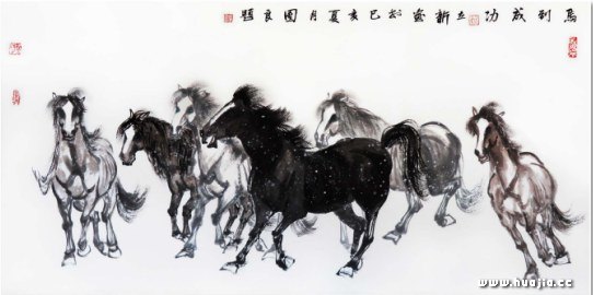 在众多的草原物象中,吴团良更钟情于画马,不管是工笔还是写意都极力去掉马的动物属性,融进自然的灵性,他的风格极具鲜明的个性色彩,主张“传神写照,中得心源,汲取传统,我用我法”。他的创作以多种构图、笔墨、色彩、造型向纵深发展,强调作品中的物象与其生存空间的密切联系,直接捕捉“画外之意”与“意外之妙”,其墨色韵律、熏染方法都让人耳目一新,令人叫绝。