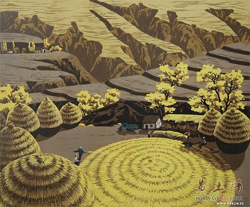 简 介: 山里最美的颜色——金黄,从山上地里转换到山下大场里,辛劳带来的喜悦洒满了大山脚下,洒落在大山的角角落落。8色绝版套色木刻,自然毁版。